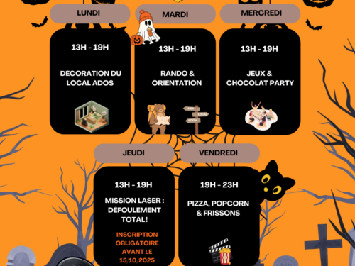 Mathieu t'attend pour les vacances de la Toussaint, au local Ados, pour une semaine frissonnante ! Du 20 au 24 octobre 2025 De 13h à 19h (sauf vendredi ...
