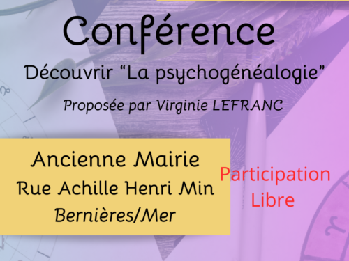 L'association ALE (Accueillir l'Energie) vous propose une conférence sur le thème "Découvrir la psychogénéalogie" avec Virginie Lefranc le samedi 11 ...